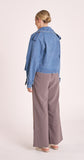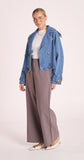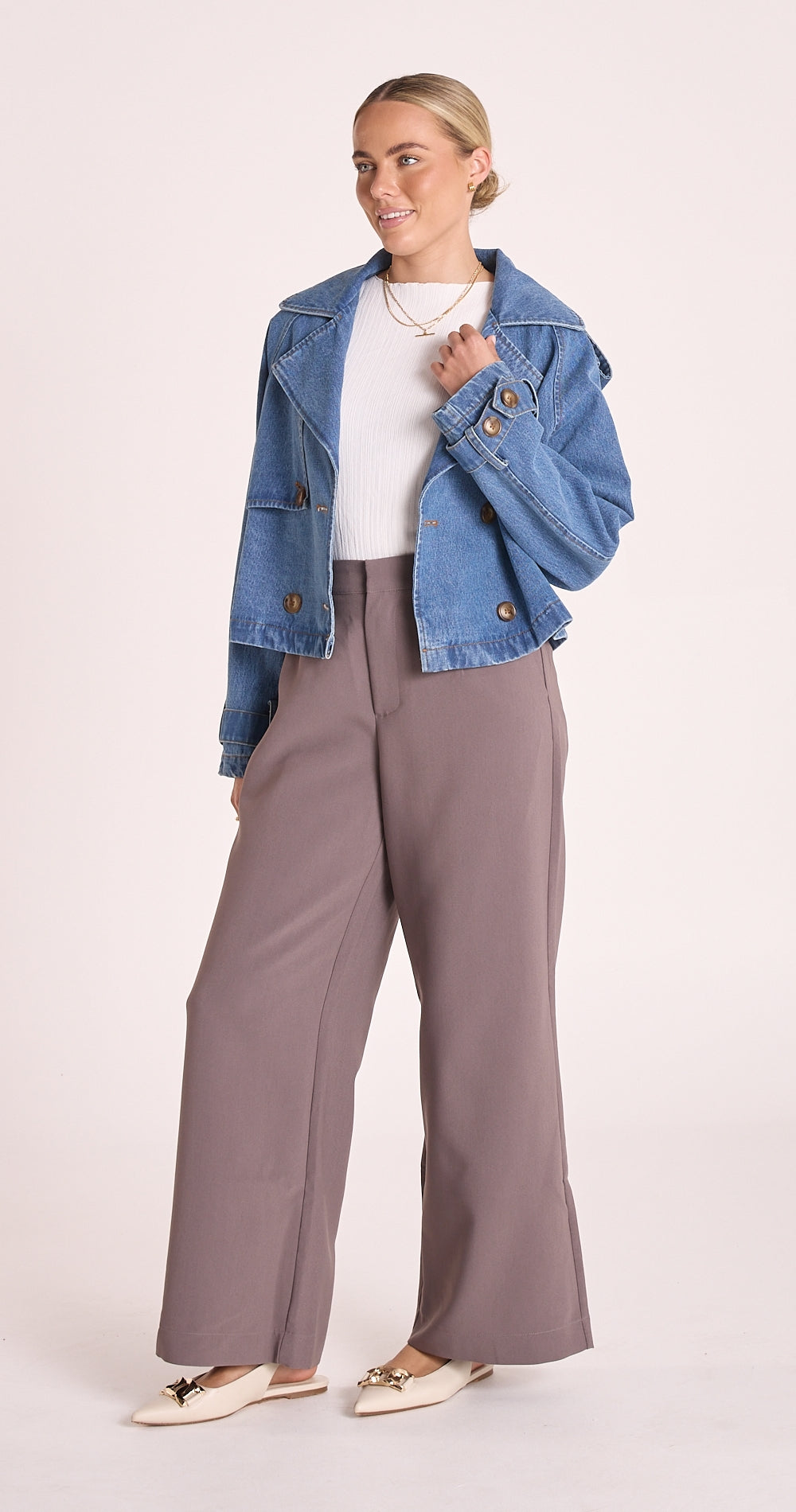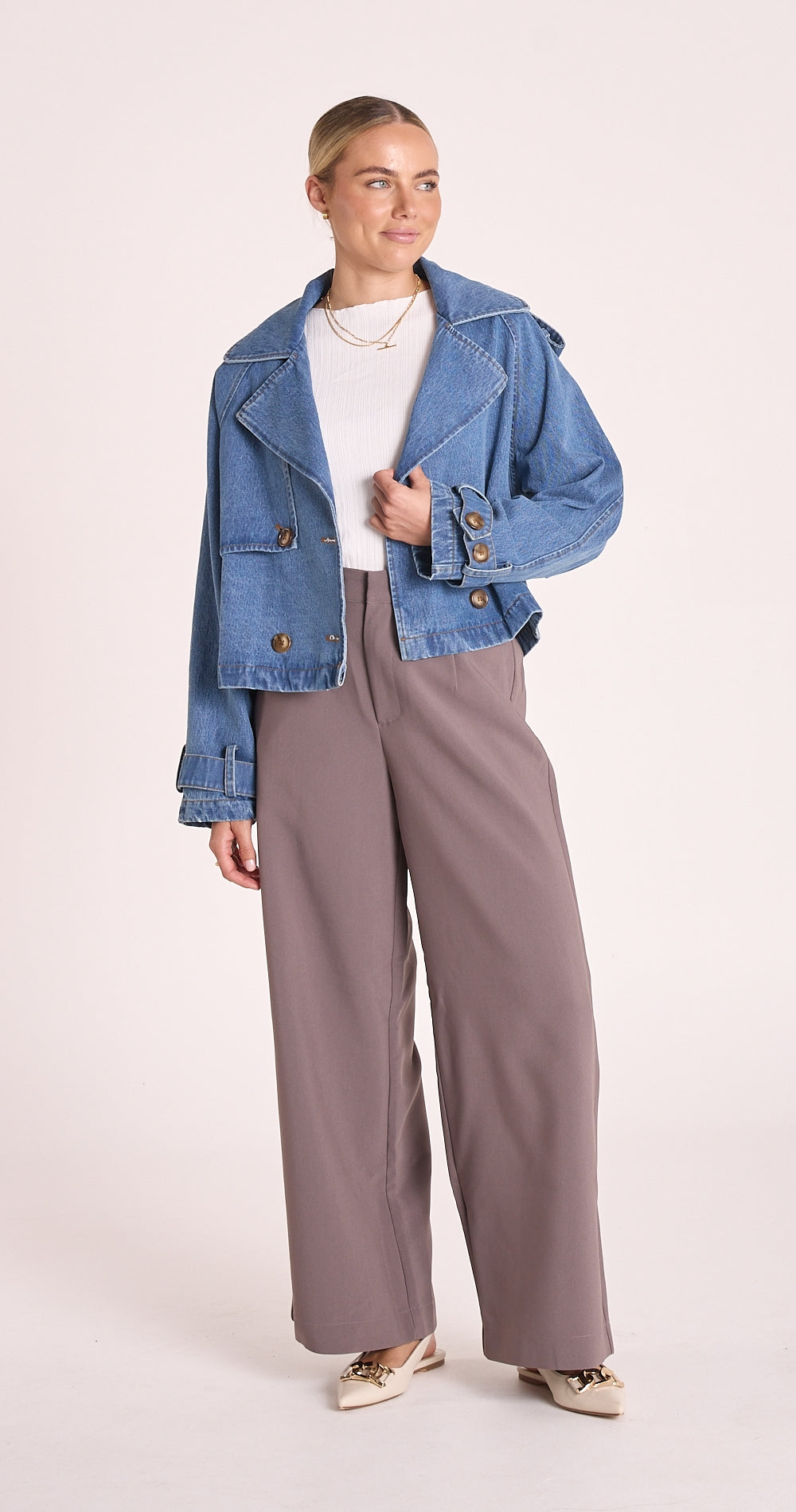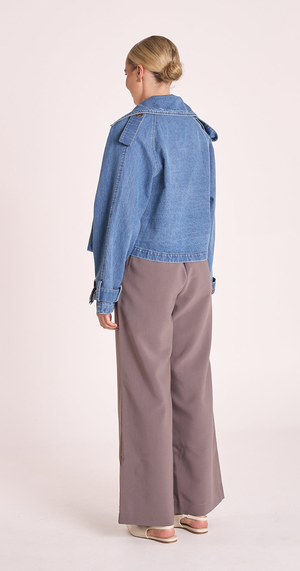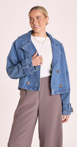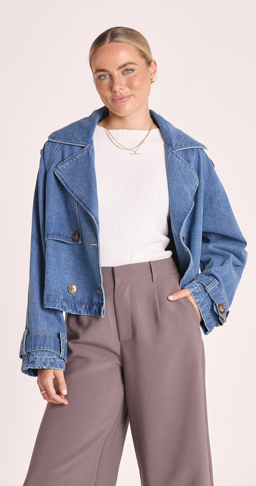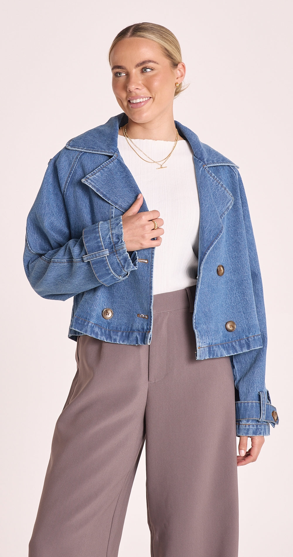 Looking for the perfect cropped jacket this season? Look no further than the stunning ‘Alexa Denim Trench’ in Blue! With the perfect length to flatter and not overwhelm an outfit, this incredible trench provides the warmth you need while being able to be dressed up and down with ease. Features include, collar, lapel, belted sleeve cuff detailing, epaulettes on shoulders, storm flap feature on chest, cropped length, double breasted button down front, tortoiseshell buttons, all finished in a 100% cotton fabrication.