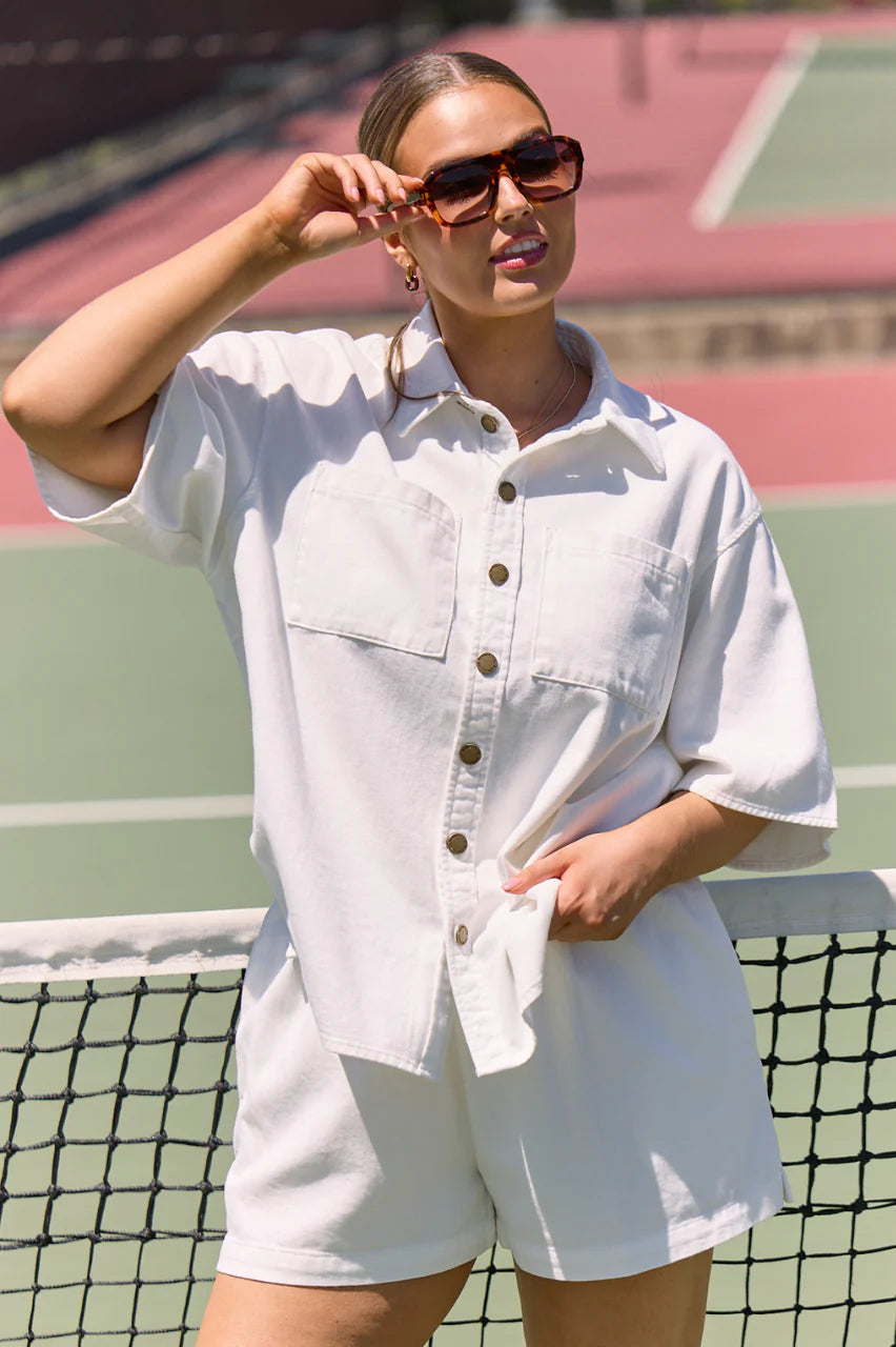With its classic cut and crisp white colouring, this denim shirt is perfect to pair with all of your wardrobe favourites this season!