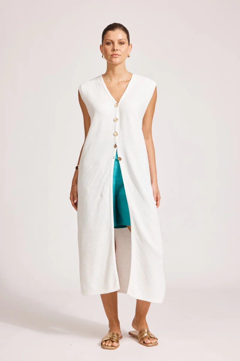A soft waffle knit vest, made to layer. Features gold buttons at waist and open hem. Longer length for versatile styling. Crafted from 100% cotton.