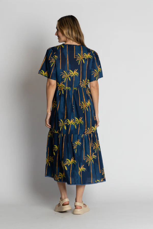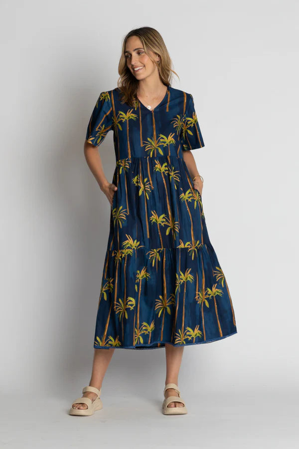 Designed in Australia and made from 100% cotton, this below-calf length dress features a relaxed fit with elbow-length sleeves and practical side pockets. Tiered gathers create soft movement, while the braid trim on the hem adds a stylish finish. Showcasing a vibrant tropical palm tree digital print, this lightweight cotton midi dress is ideal for summer holidays, beach escapes, or relaxed everyday wear.