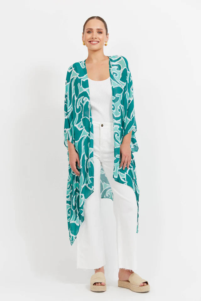 Your go-to for easy sun coverage - whether thrown over swimwear or styled with everyday pieces. Featuring an open-front design, 3/4 length sleeves, side vents, and a flowing handkerchief hem, it adds movement without the bulk. Crafted in a semi-sheer, summer-ready print.