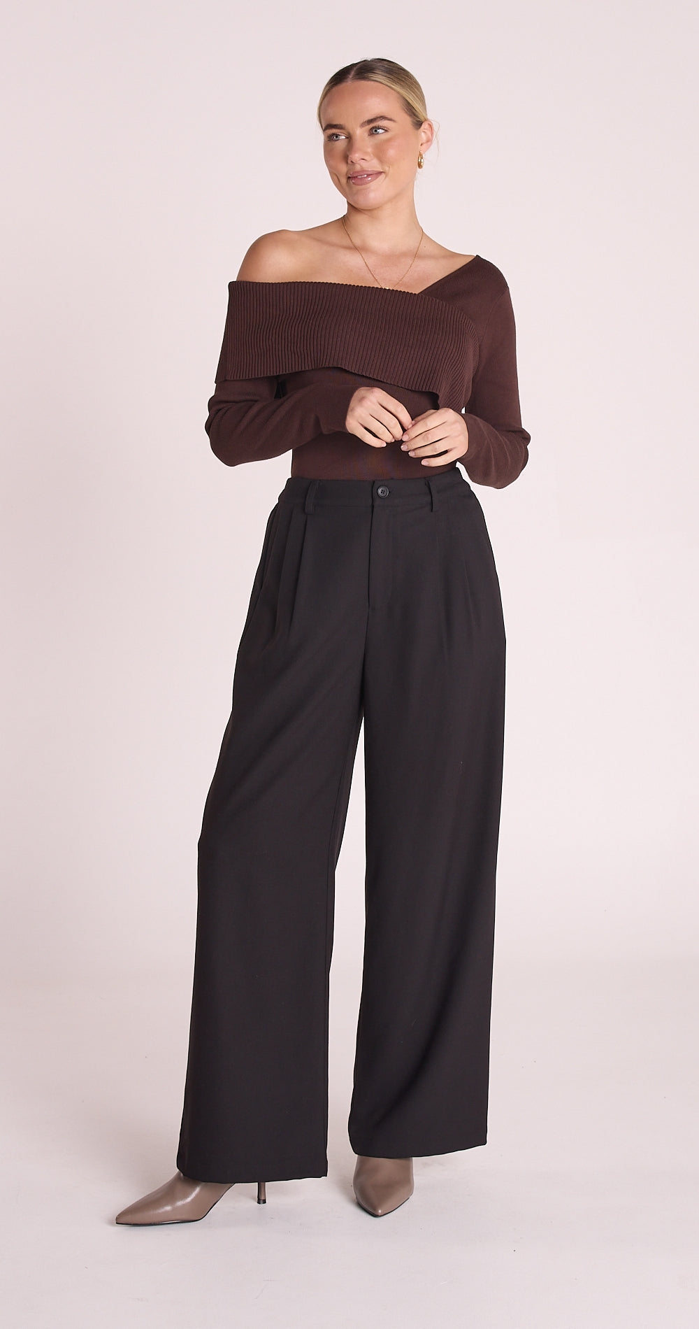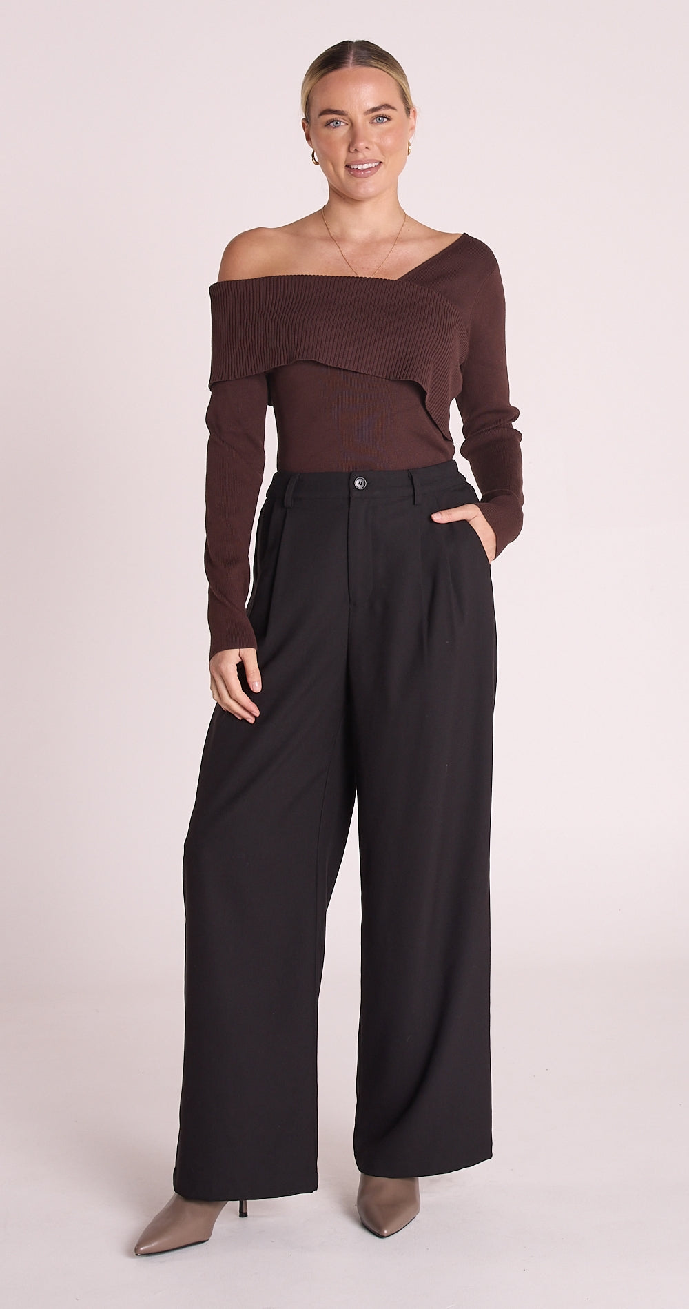 Relaxed and stylish, the 'Carmen Pant' in Black is the new go-to staple pant! With their perfect blend of style and comfort this incredible pant will take you through the seasons with ease! Features include a wide leg, high waist, belt loops, side pockets, button and zip closure, elasticated waist at the back, faux back pocket, all finished in a breathtaking black fabrication. Pair this style with our 'Molly Off Shoulder Top' in Chocolate for a fresh and polished look!