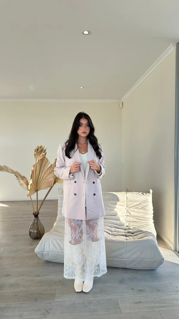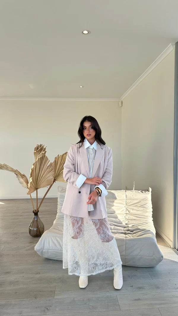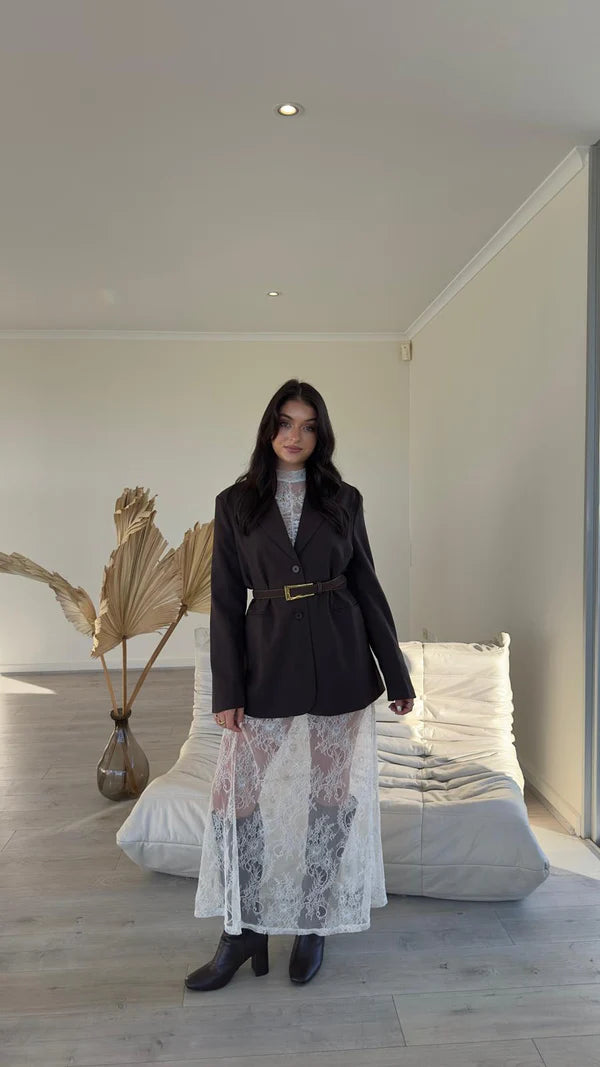 The Chantilly Skirt showcases intricate full lace accented with a hint of silver lurex that catches the light beautifully. Whether dressed up or down, this skirt adds a playful sparkle to your wardrobe.