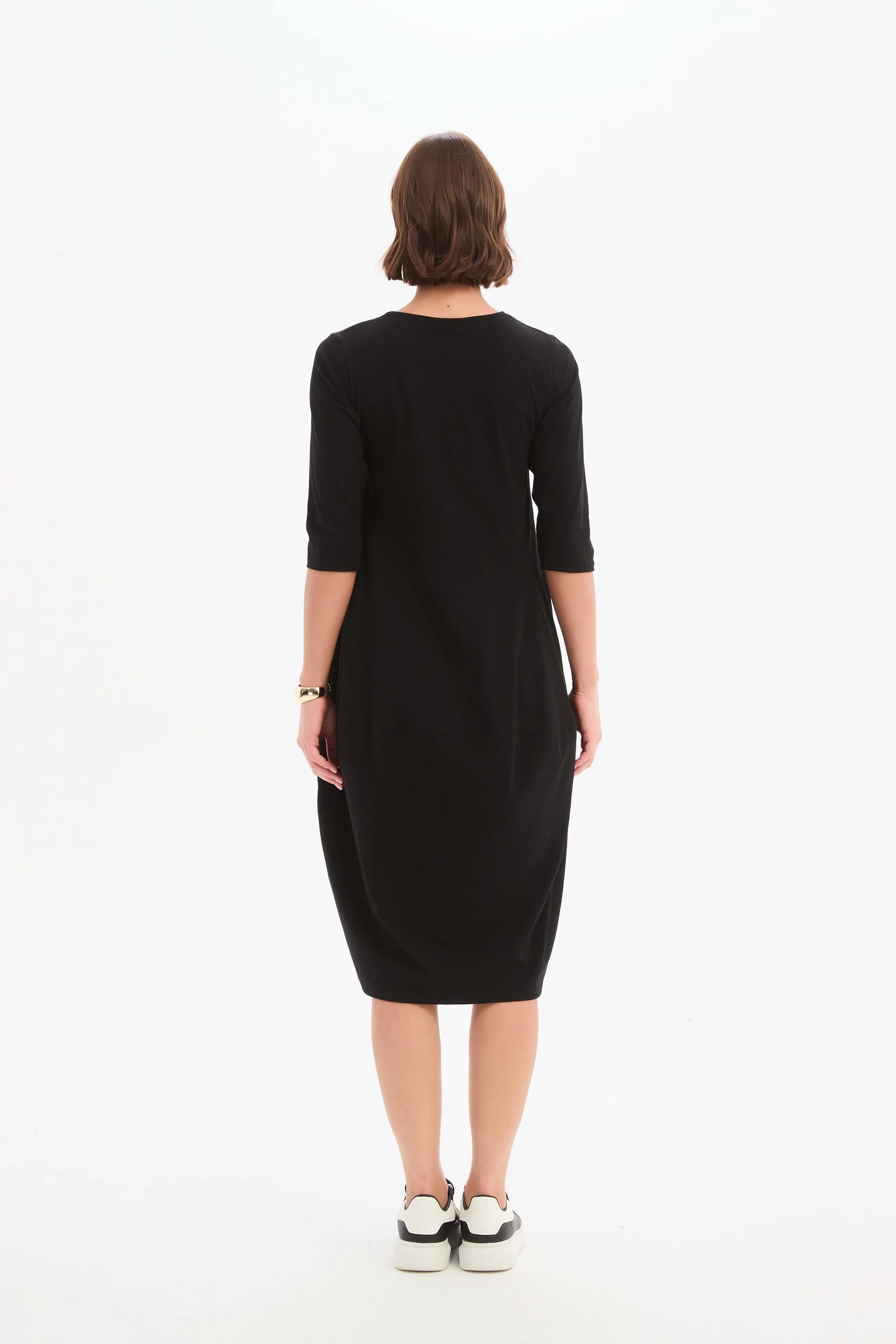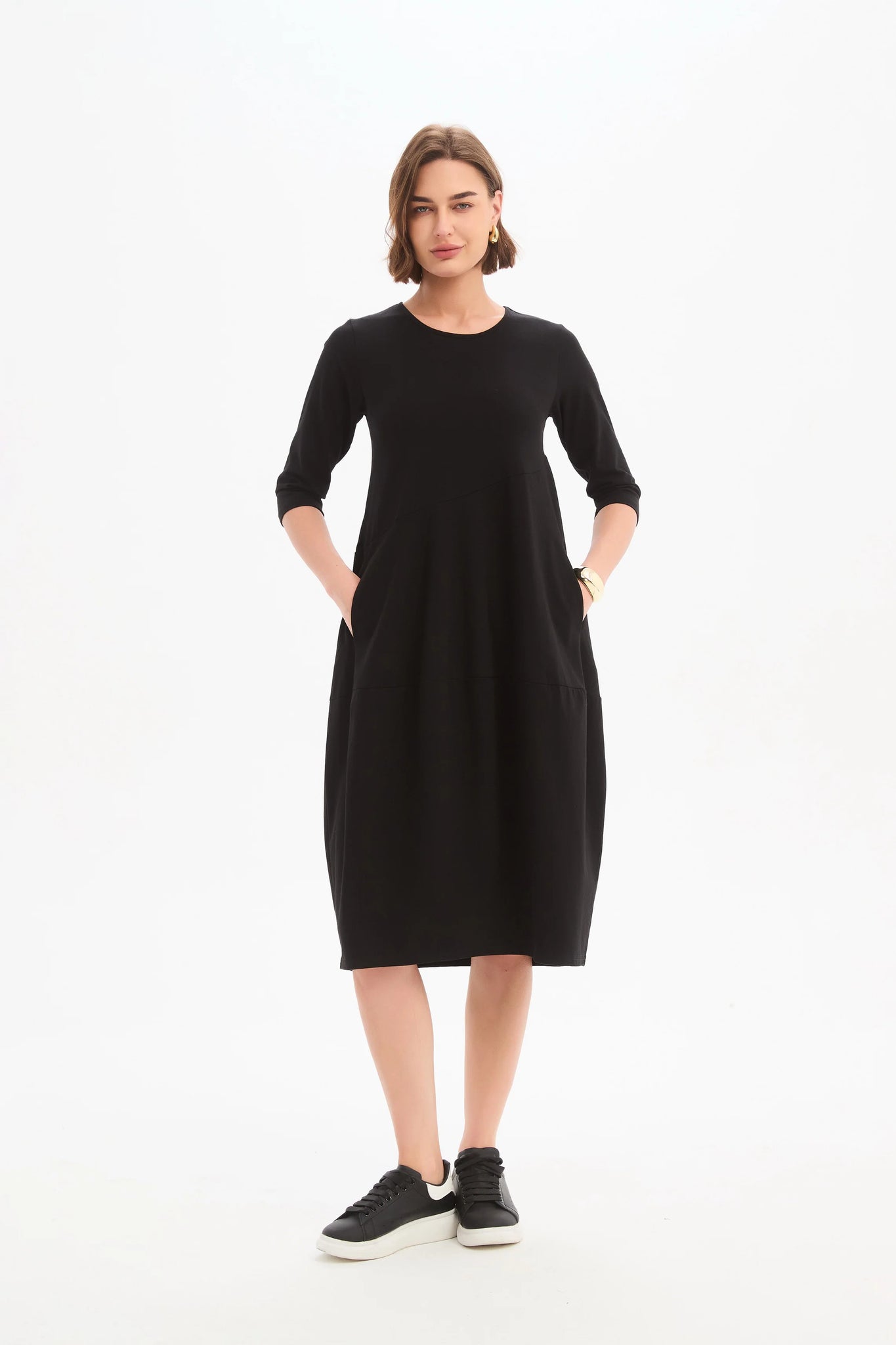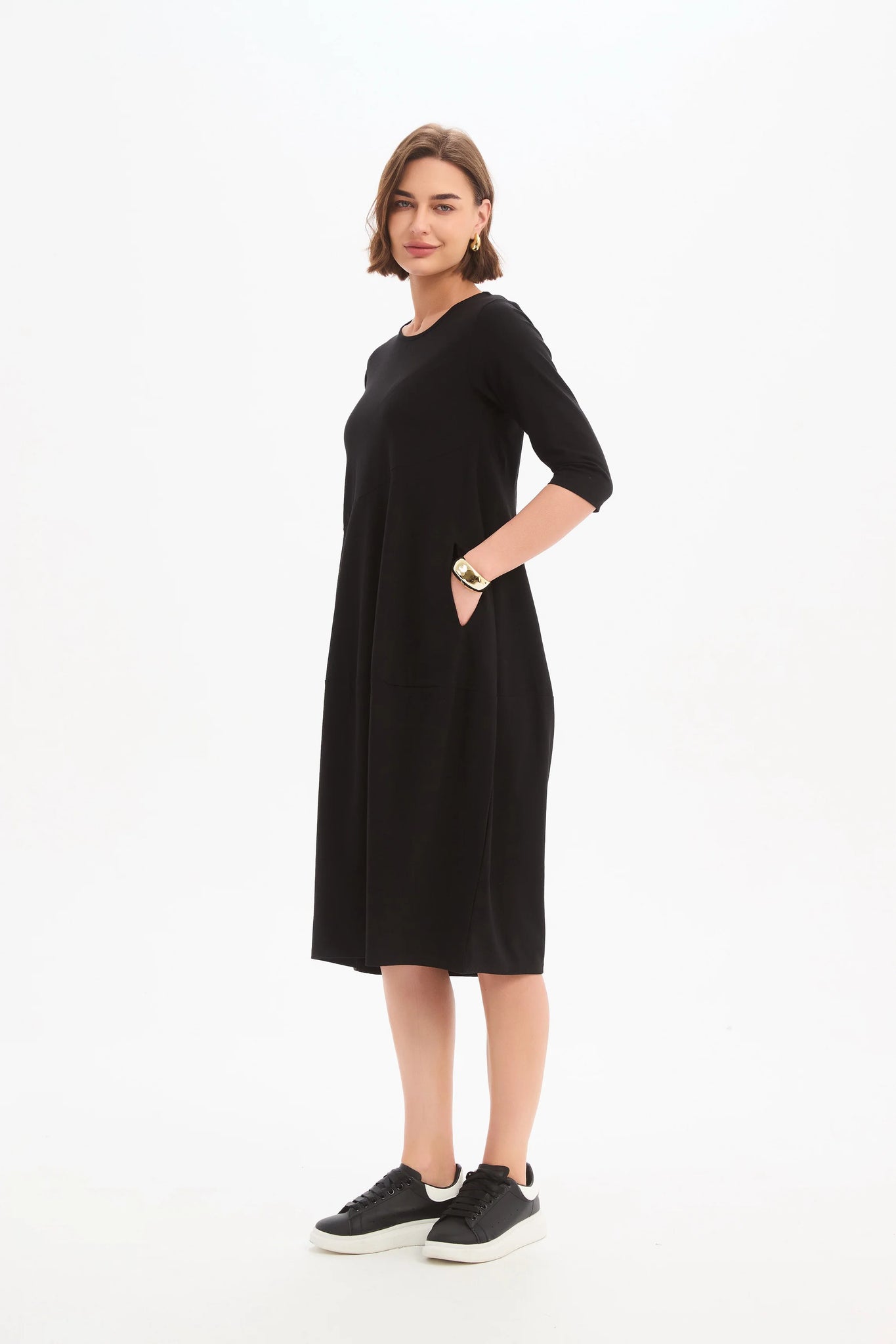 Designed for cooler weather, this midi dress features 3/4 sleeves and a flattering balloon skirt, complete with convenient side pockets for practicality. Its timeless design makes it a versatile choice for any occasion, ensuring you'll reach for it time and again.