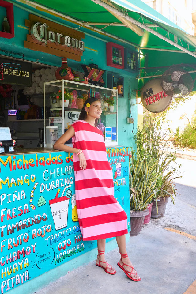 Featuring a bold stripe design, it's detailed with a wide boat neckline, extended shoulder sleeves, and contrast stitching along the seams for a refined finish. The relaxed fit and midi length with side splits make it ideal for laid-back days with a little extra style.