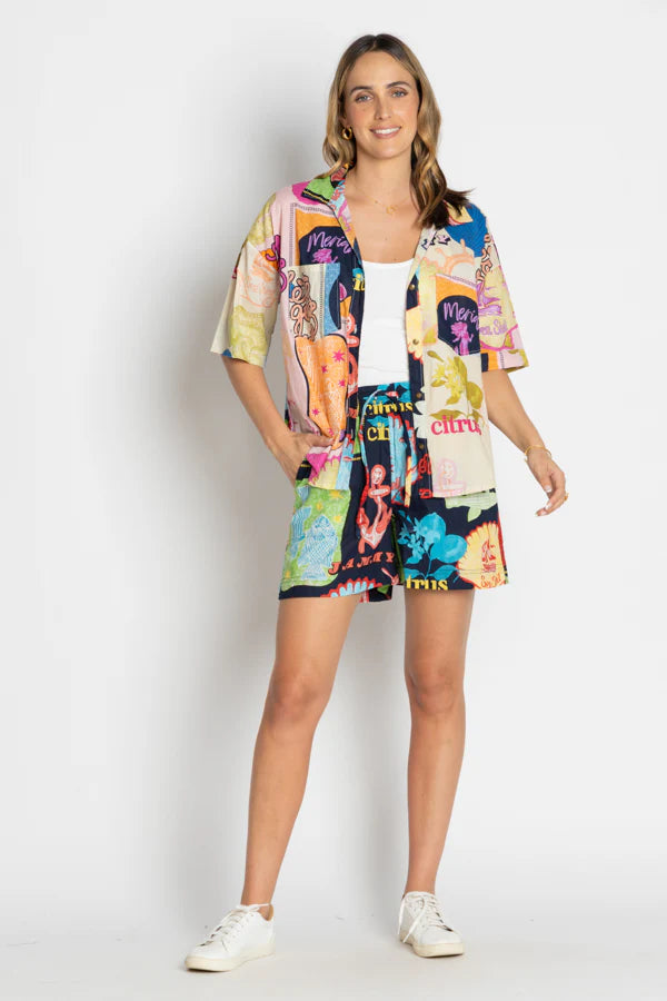 These relaxed-fit shorts feature a soft elastic waist with adjustable ties for the perfect fit, handy side and back pockets, and a vibrant digital print that adds a touch of personality. Perfect for casual days or weekend wear.
