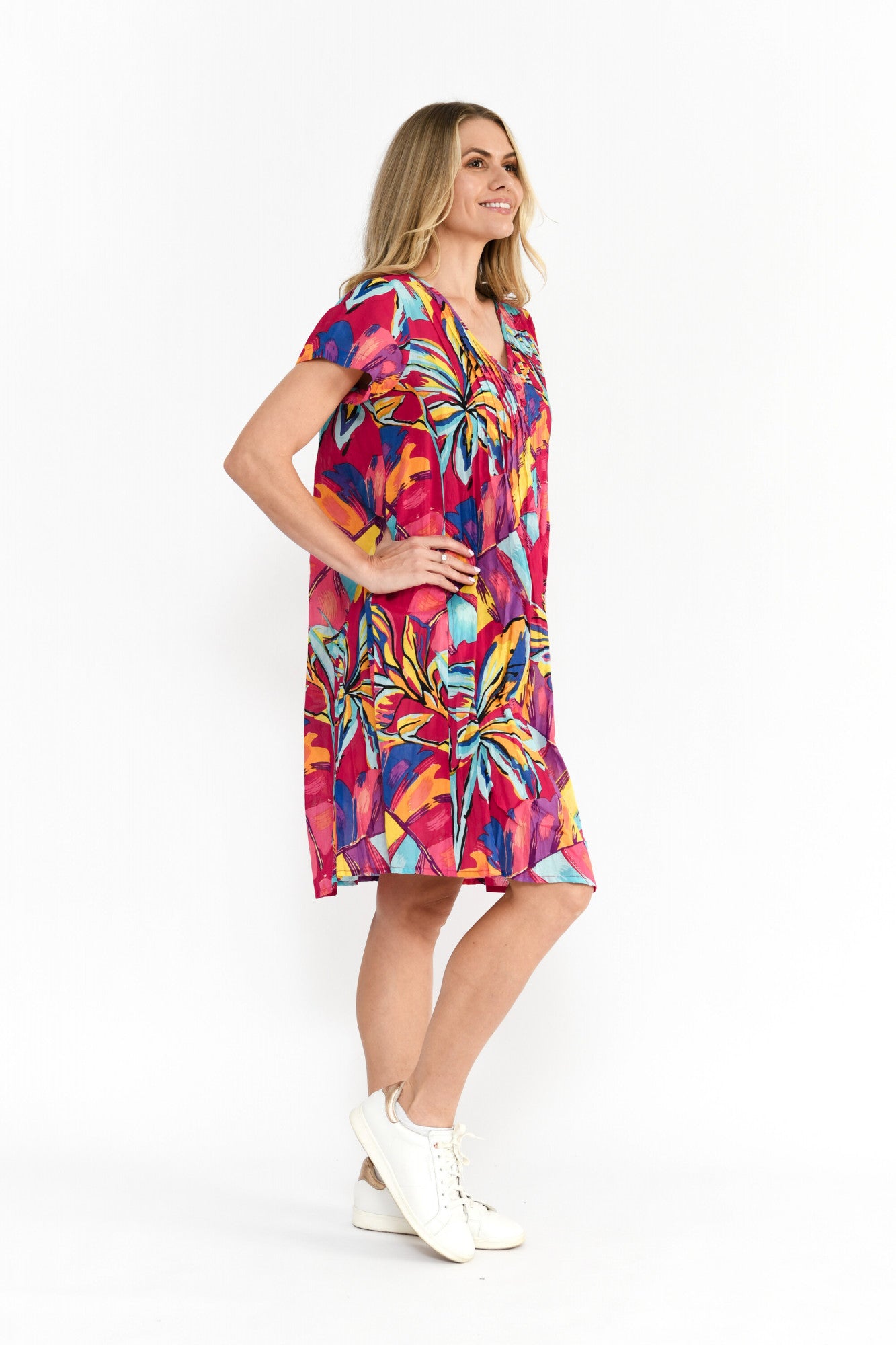 Experience summer in full bloom with our Nicola. Made from 100% cotton, and available in an array of vibrant summer prints. An One Summer must have, featuring cap sleeves, built in pockets, and pintuck detailing along the bust ensuring effortless style all summer long.